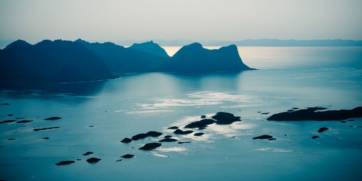 Ïle de Senja, Norvège. Fabuleuse lumière de fin d'après-midi depuis le somme de Husfjell, vers Hamn et Finnsæter.
